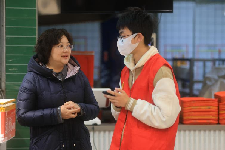 學院黨委副書記王小露和學生志愿者溝通早餐發放情況