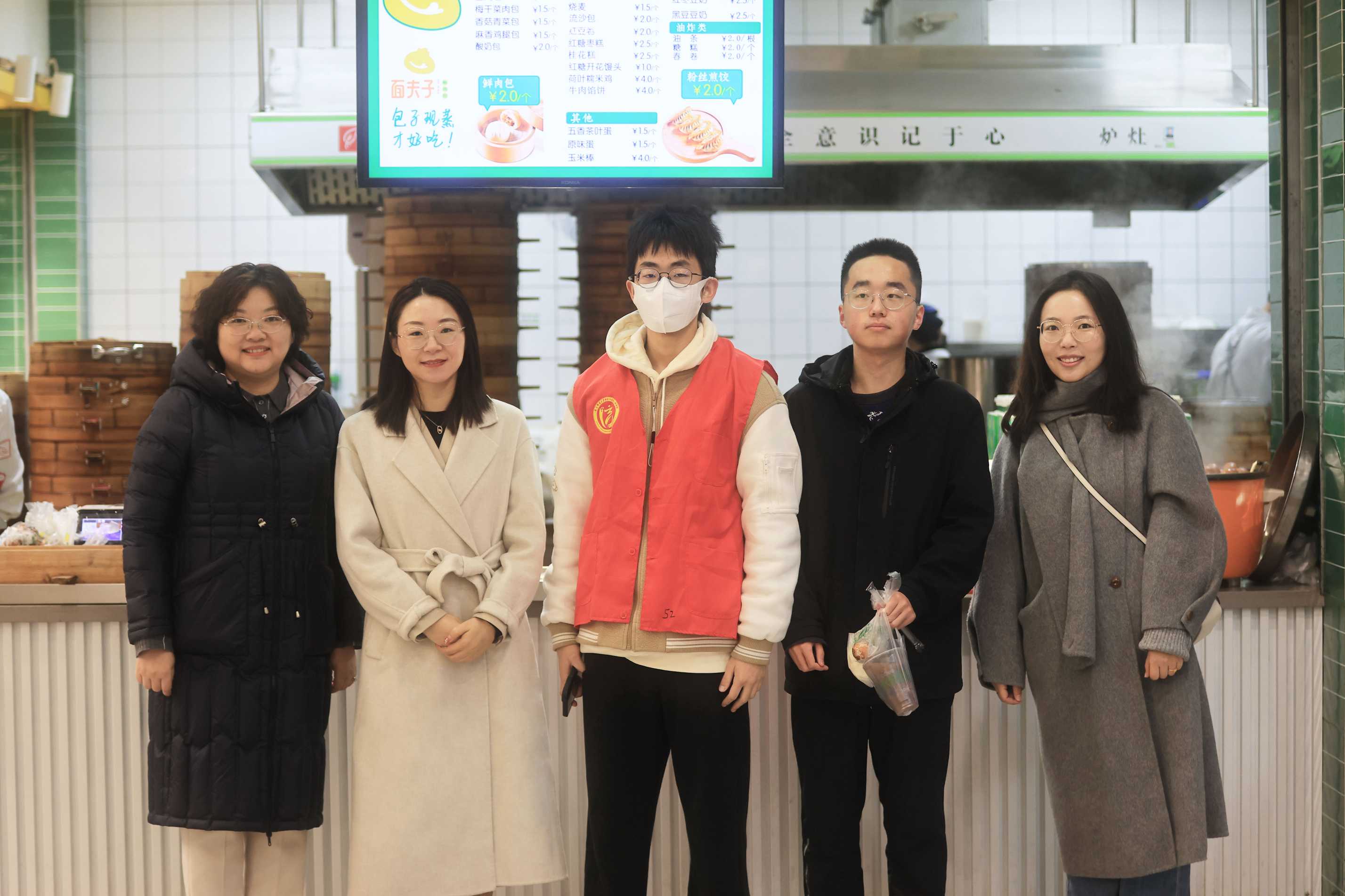 學院黨委副書記王小露、evo真人视讯科技總經理唐佩、輔導員李晨冉、學生志愿者和最后一位領取早餐的同學合影留念